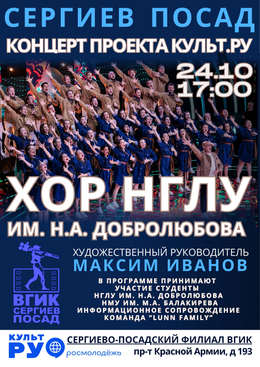 24 октября 2025 года в актовом зале Сергиево-Посадского филиала ВГИК состоится концерт Проекта «Культ.РУ» с участием Академического хора НГЛУ им. Н.А. Добролюбова и студентов НМУ им. М.А. Балакирева.