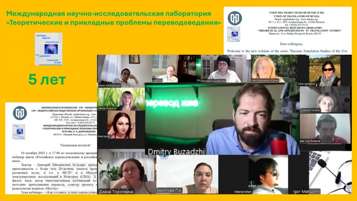 Открывая очередной сезон вебинаров, проводимых Международной научно-исследовательской лабораторией «Теоретические и прикладные проблемы переводоведения» НГЛУ вместе с Союзом переводчиков России, начальник МНИЛ Ольга Петрова отметила, что в этом году цикл вебинаров «Российское переводоведение и российские переводоведы XXI века» посвящается юбилею лаборатории, которой исполнилось 5 лет. За эти годы она стала исследовательской и информационной площадкой для профессионального общения переводоведов разных стран.