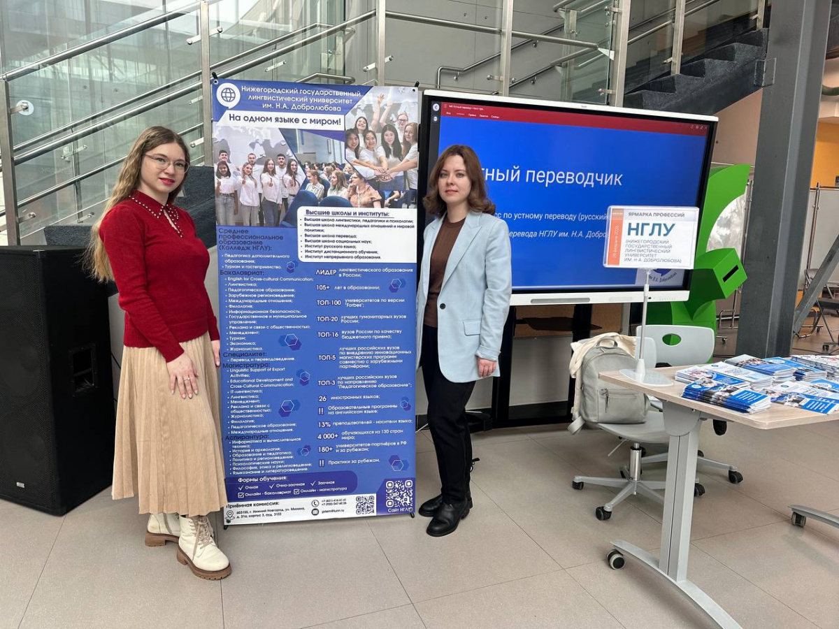 Старший преподаватель кафедры английского языка Высшей школы перевода Елена Лешканова и специалист Центра компетенций Нижегородского государственного лингвистического университета им. Н.А. Добролюбова Анна Кузнецова представили образовательные программы среднего профессионального и высшего образования НГЛУ на Ярмарке профессий в Школе 800.