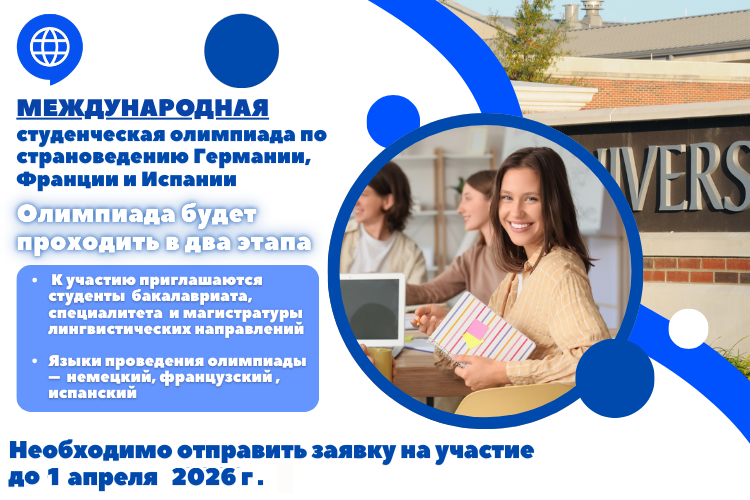 Нижегородский государственный лингвистический университет им. Н. А. Добролюбова совместно с Московским государственным лингвистическим университетом, Беларусским государственным университетом иностранных языков (Республика Беларусь) и Мордовским государственным университетом им. Н. П. Огарева в рамках деятельности Консорциума лингвистических университетов проводят Международную студенческую олимпиаду по страноведению Германии, Франции и Испании с 4 по 18 апреля 2026 в дистанционном формате. К участию приглашаются студенты бакалавриата, специалитета и магистратуры лингвистических направлений. Языки проведения олимпиады – немецкий, французский, испанский.