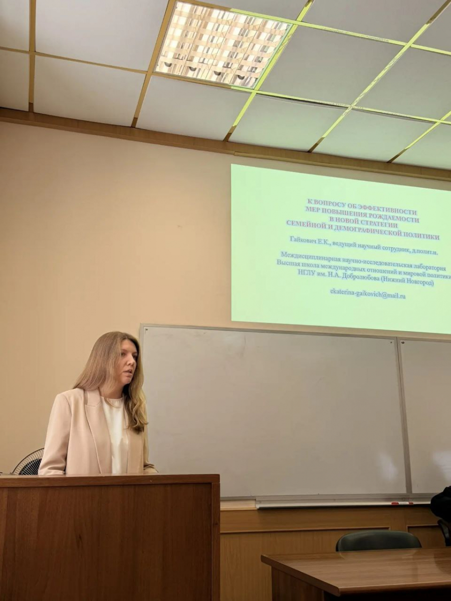 Екатерина Гайкович выступила с докладом на тему «К вопросу об эффективности мер повышения рождаемости в новой Стратегии демографического развития РФ». В докладе были озвучены результаты исследований коллектива учёных НИЛ НГЛУ «Изучение мировых и региональных социально-политических процессов».
